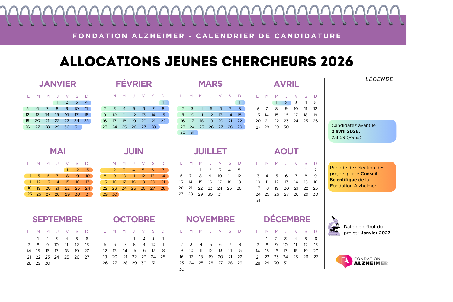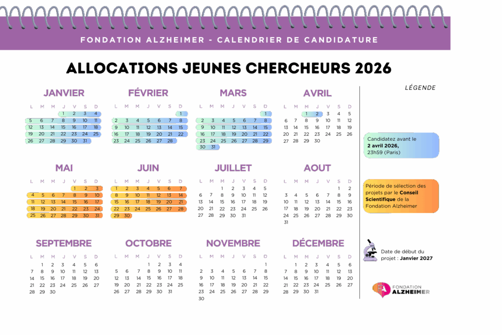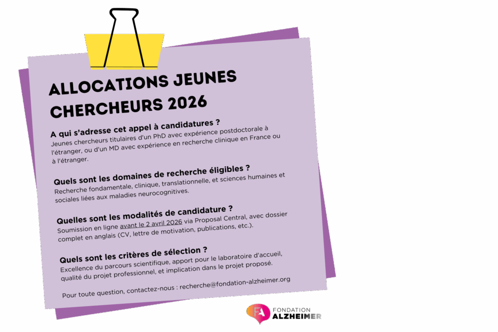 L’accroissement significatif de la masse critique des chercheurs dans le champ des maladies neurocognitives dont la maladie d’Alzheimer est un enjeu important pour pouvoir lutter efficacement contre ces maladies. C’est dans cet objectif que la Fondation Alzheimer lance son appel à projet « Allocation Jeunes Chercheurs » pour permettre à de jeunes chercheurs de formation scientifique ou médicale de poursuivre leurs travaux de recherche sur la maladie d’Alzheimer et plus largement des maladies neurocognitives, dans un laboratoire public français, avec comme objectif de renforcer leur cursus professionnel et d’obtenir un emploi académique permanent en France.