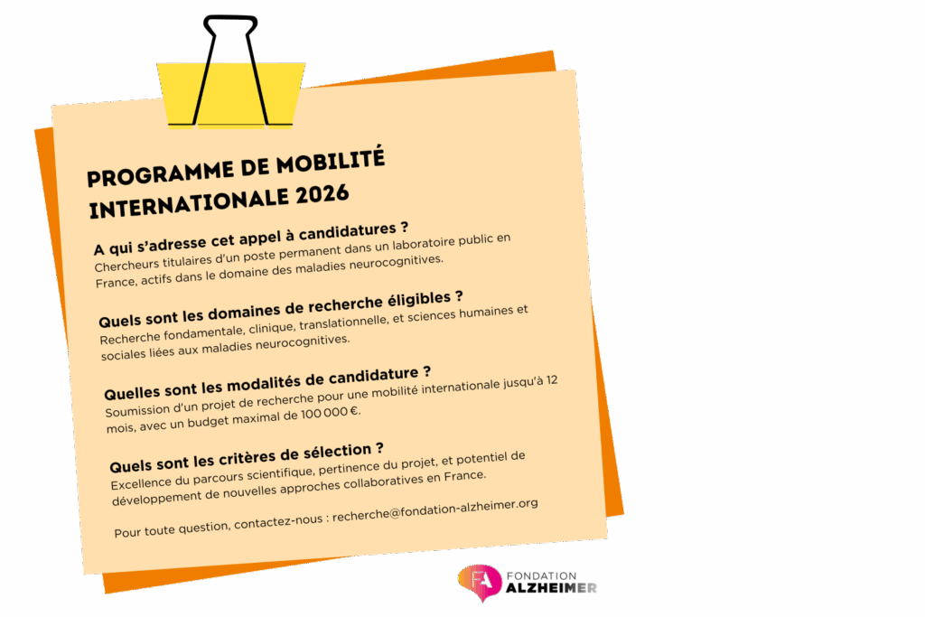L’accroissement significatif de la masse critique des chercheurs hautement qualifiés internationalement dans le champ des maladies neurocognitives dont la maladie d’Alzheimer, est un enjeu important pour pouvoir lutter efficacement contre ces maladies. C’est dans cet objectif que la Fondation Alzheimer lance son appel à projet « Programme de mobilité internationale » pour permettre à des chercheurs de formation scientifique ou médicale d’étendre leurs compétences en recherche, dans un laboratoire public étranger, avec comme objectif de développer de nouvelles approches et d’initier des travaux collaboratifs de retour de France.