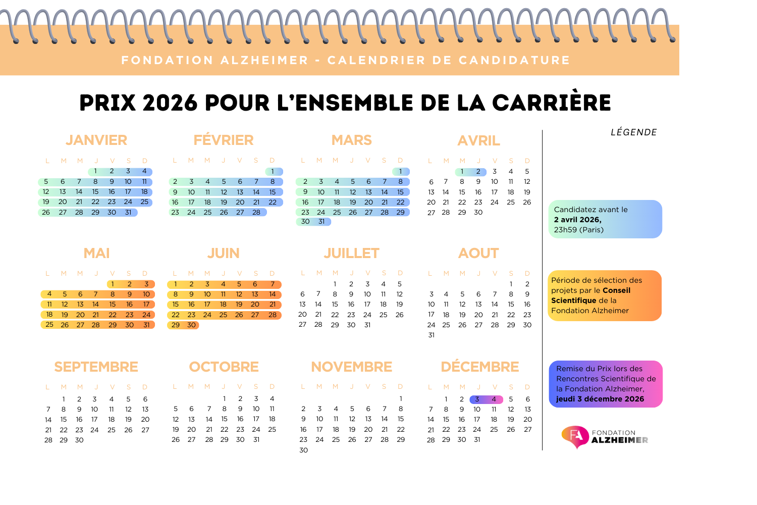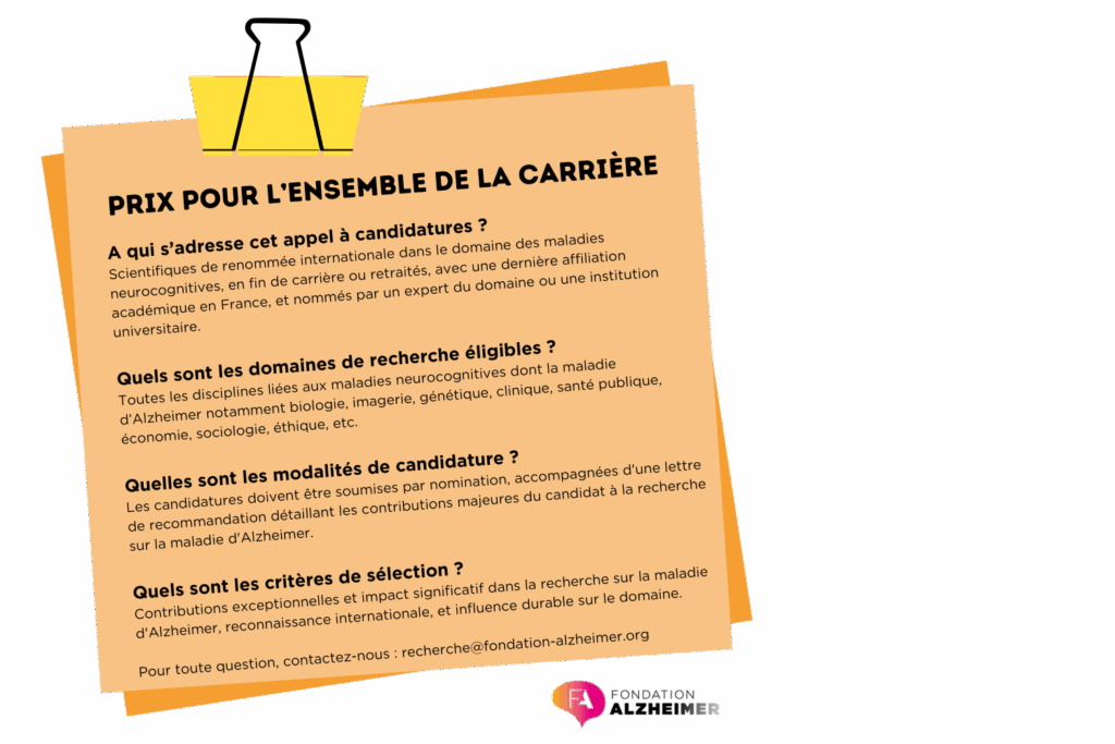- Remise des Prix : le 3 décembre 2026 lors des Rencontres Scientifiques de la Fondation Alzheimer