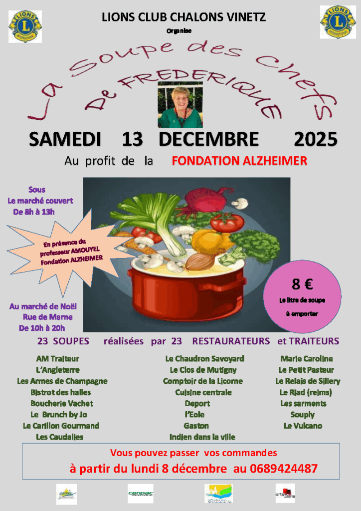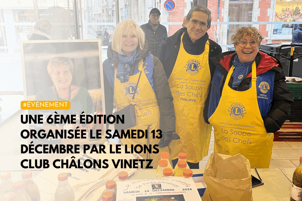Ce samedi 13 décembre 2024, Châlons-en-Champagne accueillera la 6ᵉ édition de la Soupe des Chefs de Frédérique, une opération conviviale, gourmande et solidaire organisée par le Lions Club Châlons Vinetz en hommage à Frédérique Muller.